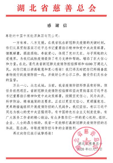 湖北省疫情防控指揮部、湖北省慈善總會致中煤集團感謝信