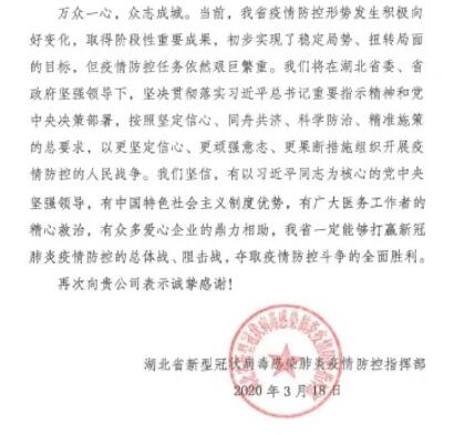 信中寫道:在湖北省抗擊新冠肺炎疫情的關鍵時刻,貴公司認真貫徹落實習近平總書記重要指示精神和黨中央決策部署,慷慨解囊、奉獻愛心,捐贈善款3000萬元,體現(xiàn)了豈曰無衣、與子同袍的大愛情懷,體現(xiàn)了中央企業(yè)的鐵肩擔當和無私境界,為我們戰(zhàn)勝疫情提供了有力支持和幫助,增添了巨大信心和力量。