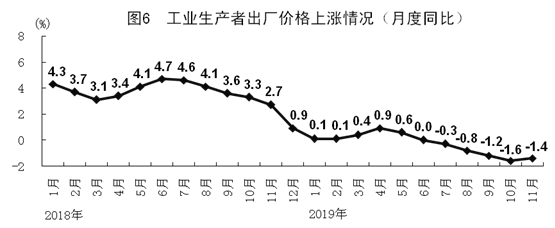 11月份,全國工業(yè)生產(chǎn)者出廠價(jià)格同比下降1.4%,降幅比上月收窄0.2個(gè)百分點(diǎn),環(huán)比下降0.1%。工業(yè)生產(chǎn)者購進(jìn)價(jià)格同比下降2.2%,環(huán)比下降0.1%。1-11月份,工業(yè)生產(chǎn)者出廠價(jià)格同比下降0.3%,工業(yè)生產(chǎn)者購進(jìn)價(jià)格下降0.7%。