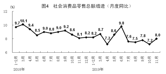 11月份,社會(huì)消費(fèi)品零售總額38094億元,同比增長(zhǎng)8.0%,增速比上月加快0.8個(gè)百分點(diǎn)。其中,扣除汽車以外的社會(huì)消費(fèi)品零售總額增長(zhǎng)9.1%。1-11月份,社會(huì)消費(fèi)品零售總額372872億元,同比增長(zhǎng)8.0%。按經(jīng)營(yíng)單位所在地分,11月份,城鎮(zhèn)消費(fèi)品零售額32345億元,增長(zhǎng)7.9%;鄉(xiāng)村消費(fèi)品零售額5748億元,增長(zhǎng)9.1%。按消費(fèi)類型分,餐飲收入4964億元,增長(zhǎng)9.7%;商品零售33130億元,增長(zhǎng)7.8%。消費(fèi)升級(jí)類商品較快增長(zhǎng)。限額以上單位化妝品類、飲料類和通訊器材類商品分別增長(zhǎng)16.8%、13.0%和12.1%,增速分別快于全部社會(huì)消費(fèi)品零售總額8.8、5.0和4.1個(gè)百分點(diǎn)。