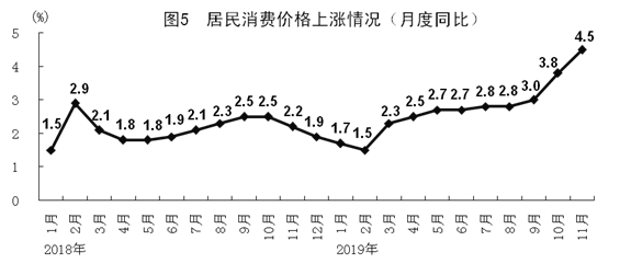 11月份,全國居民消費(fèi)價(jià)格同比上漲4.5%,漲幅比上月擴(kuò)大0.7個(gè)百分點(diǎn);環(huán)比上漲0.4%,漲幅比上月回落0.5個(gè)百分點(diǎn)。分類別看,食品煙酒價(jià)格同比上漲13.9%,衣著上漲1.1%,居住上漲0.4%,生活用品及服務(wù)上漲0.4%,交通和通信下降2.8%,教育文化和娛樂上漲1.7%,醫(yī)療保健上漲2.0%,其他用品和服務(wù)上漲4.5%。在食品煙酒價(jià)格中,糧食價(jià)格上漲0.7%,豬肉上漲110.2%,鮮菜上漲3.9%,鮮果下降6.8%。扣除食品和能源價(jià)格后的核心CPI上漲1.4%。1-11月份,全國居民消費(fèi)價(jià)格同比上漲2.8%。