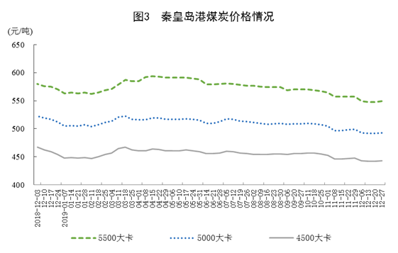 煤炭價(jià)格回落。12月27日,秦皇島港5500大卡、5000大卡和4500大卡煤炭綜合交易價(jià)格分別為每噸549元、493元和443元,比11月29日分別回落8元、6元和5元。