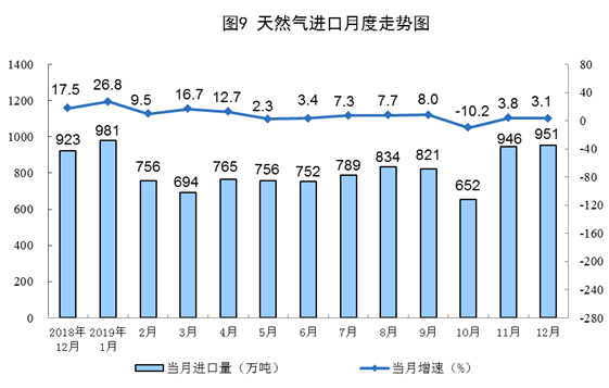 12月份,進(jìn)口天然氣951萬噸,同比增長3.1%。2019年進(jìn)口天然氣9656萬噸,比上年增長6.9%。